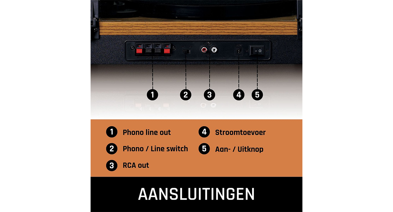 Verpakkingsinhoud Platenspeler, element, netadapter, verloopstekker, slipmat, 45 RPM adapter, stofkap, 2 luidsprekers, 2 luidsprekerkabels, handleidingen (NL/EN/DE/FR/ES)